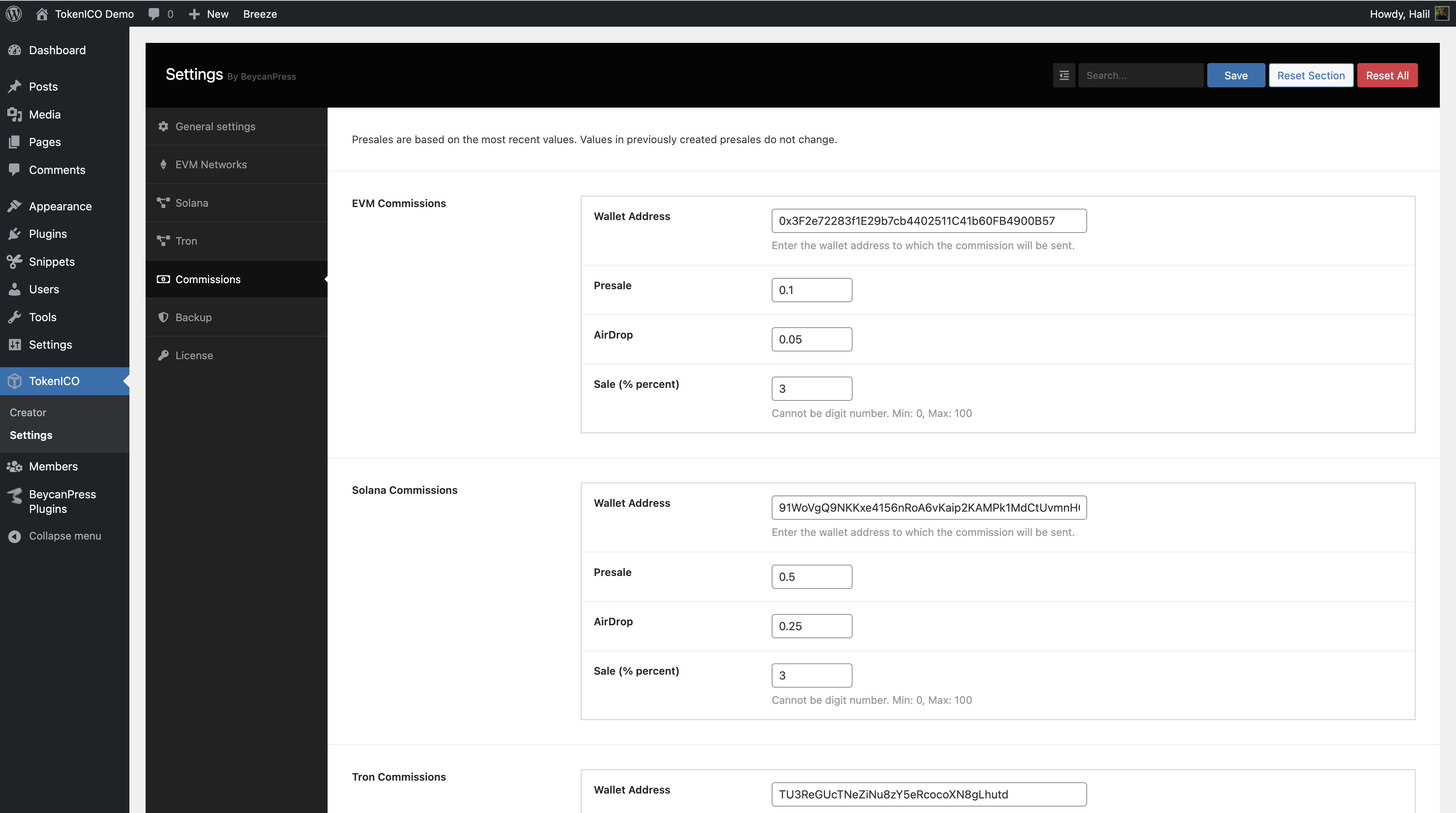 In Premium, all you need to do is enter your wallet addresses in the Commissions field added to the settings after activation and of course adjust the commission values to your liking.
